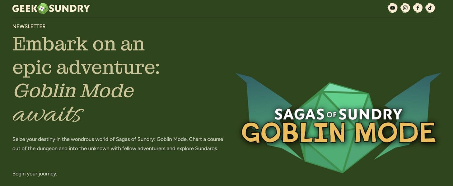 On August 14th the official Geek and Sundry Youtube channel announced the Sagas of Sundry! A new gaihomebrew actual play series set in an original setting called Sundros. They’re starting with Goblin Mode on September 9th on their youtube. It appears to be an actual-play podcast with a video feed as well and will be available to all.